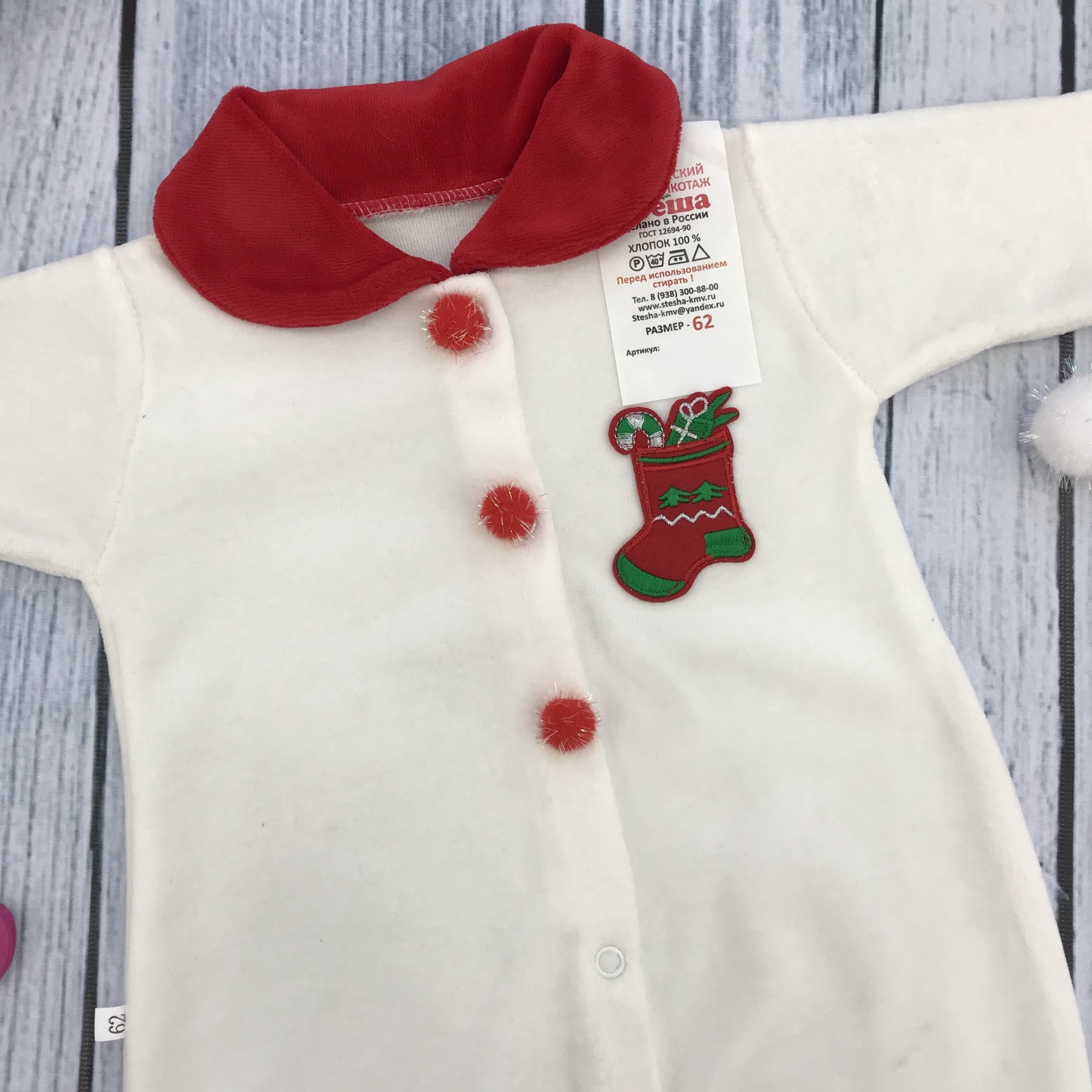 Теги: Купить оптом новогодний комбинезон от производителя. 244. Комбинезон Санта, хлопок 80% велюр 20% ПЭ, молочный 56,62,68 цена,отзывы официальный сайт "Стеша Ачинск"