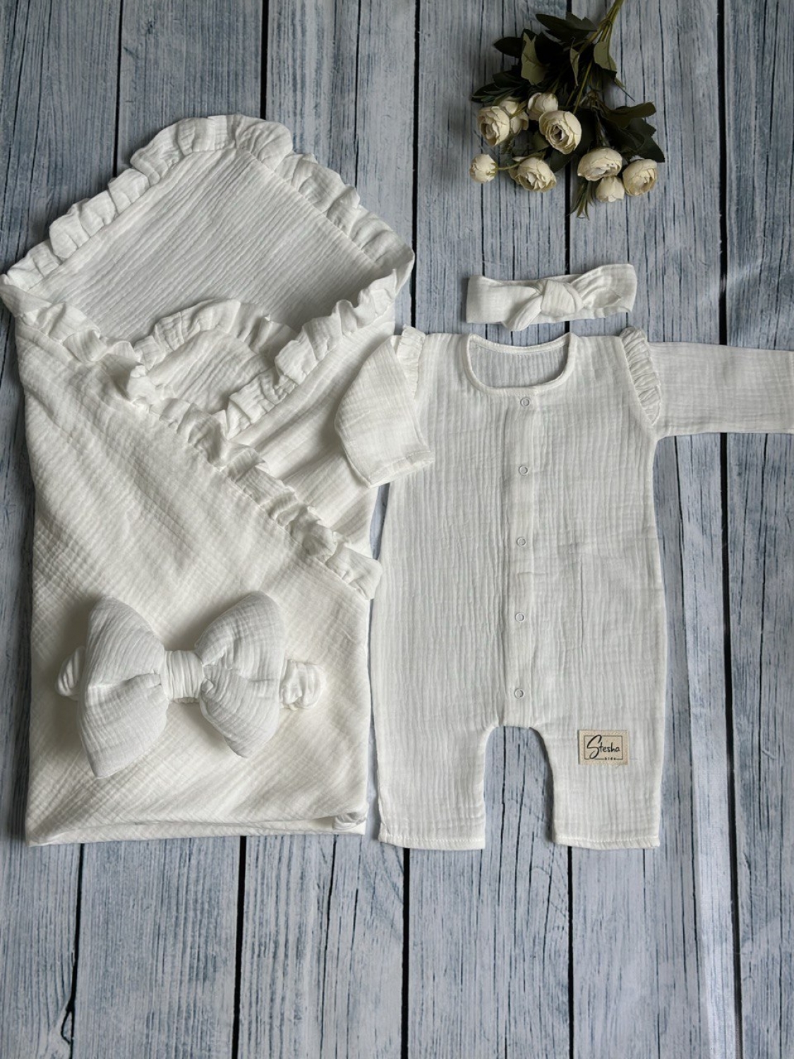 335-М. Комплект из детского комбинезона, р 56 и конверта муслин, хлопок 100% 90/90 см, молочный